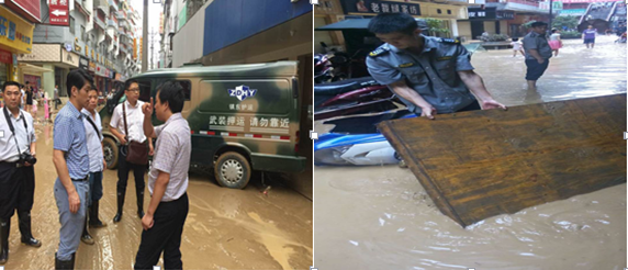 銅仁本部負責人陳葉接到電話報告后,第一時間率領(lǐng)應急人員趕赴一線,與市公安局治安支隊吳支隊長、市工行吳行長一同到現(xiàn)場指揮抗洪救災工作。