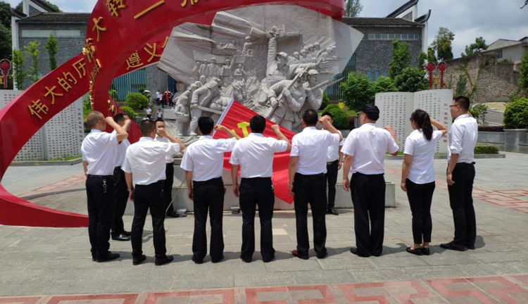 在位于甕安縣的猴場會議紀念館,全體黨員、預(yù)備黨員肅立在革命烈士雕像前,舉起右手,重溫了加入中國共產(chǎn)黨時的宣誓詞。短短幾十字的宣誓詞,無形之中在警醒、提示和規(guī)范每一位黨員同志的先鋒模范作用。