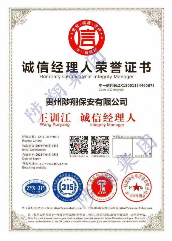 誠(chéng)信經(jīng)理人榮譽(yù)證書